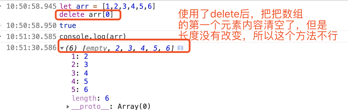 数组的本质是对象,那我们能不能使用删除对象的方法呢?答案是不行,请看下图