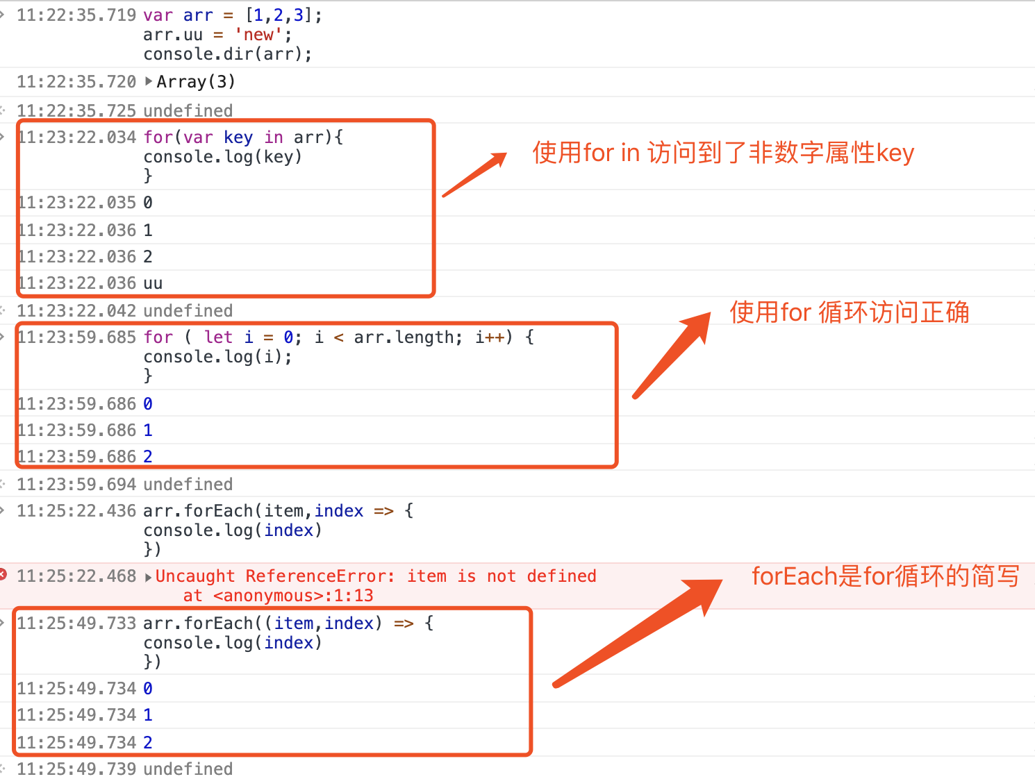 如果要查看对象的属性名与值,我们可以使用for in ,但是在数组中,要使用for循环,因为for in 会查看到非数字属性名;