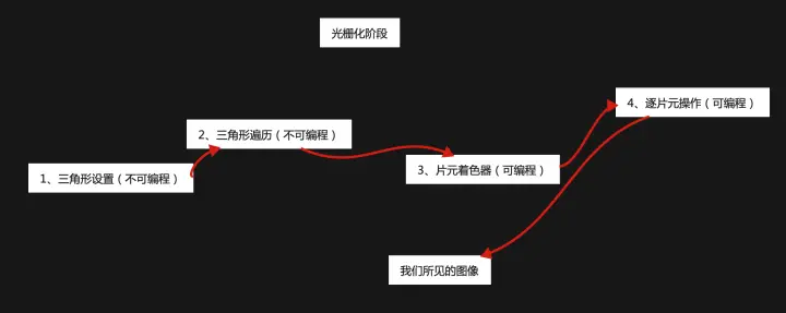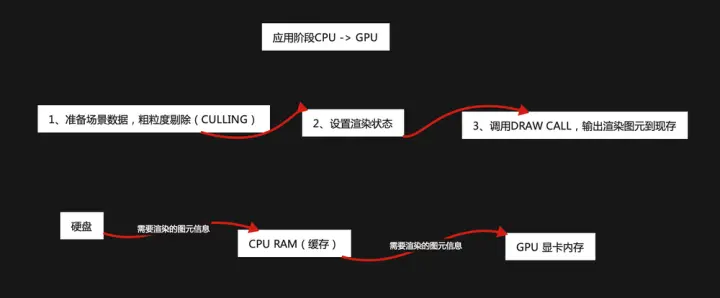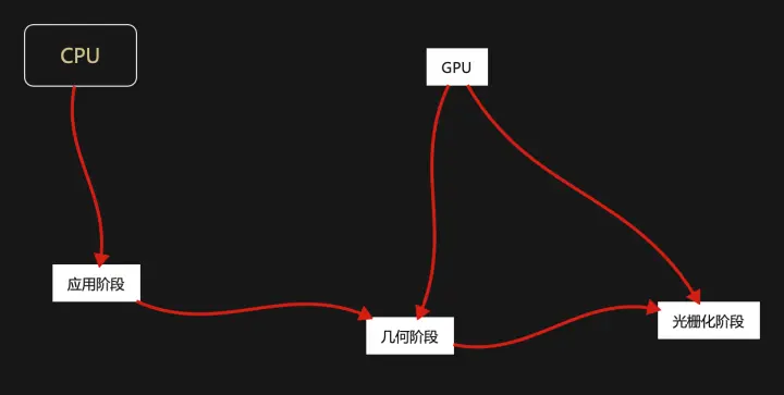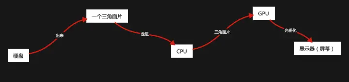 从宏观概念上来说:从硬盘上 - 出来 -> 一个三角面片 - 走进 -> CPU - 三角面片 -> GPU - 光栅化 -> 显示器(屏幕)
