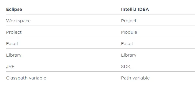 **由下图可见:**两者最大的转变就在于工作空间概念的转变,并且在IDEA当中,Project和Module是作为两个不同的概念,对项目结构是重要意义的,这也恰恰是许多IDEA初学者觉得困扰的地方。