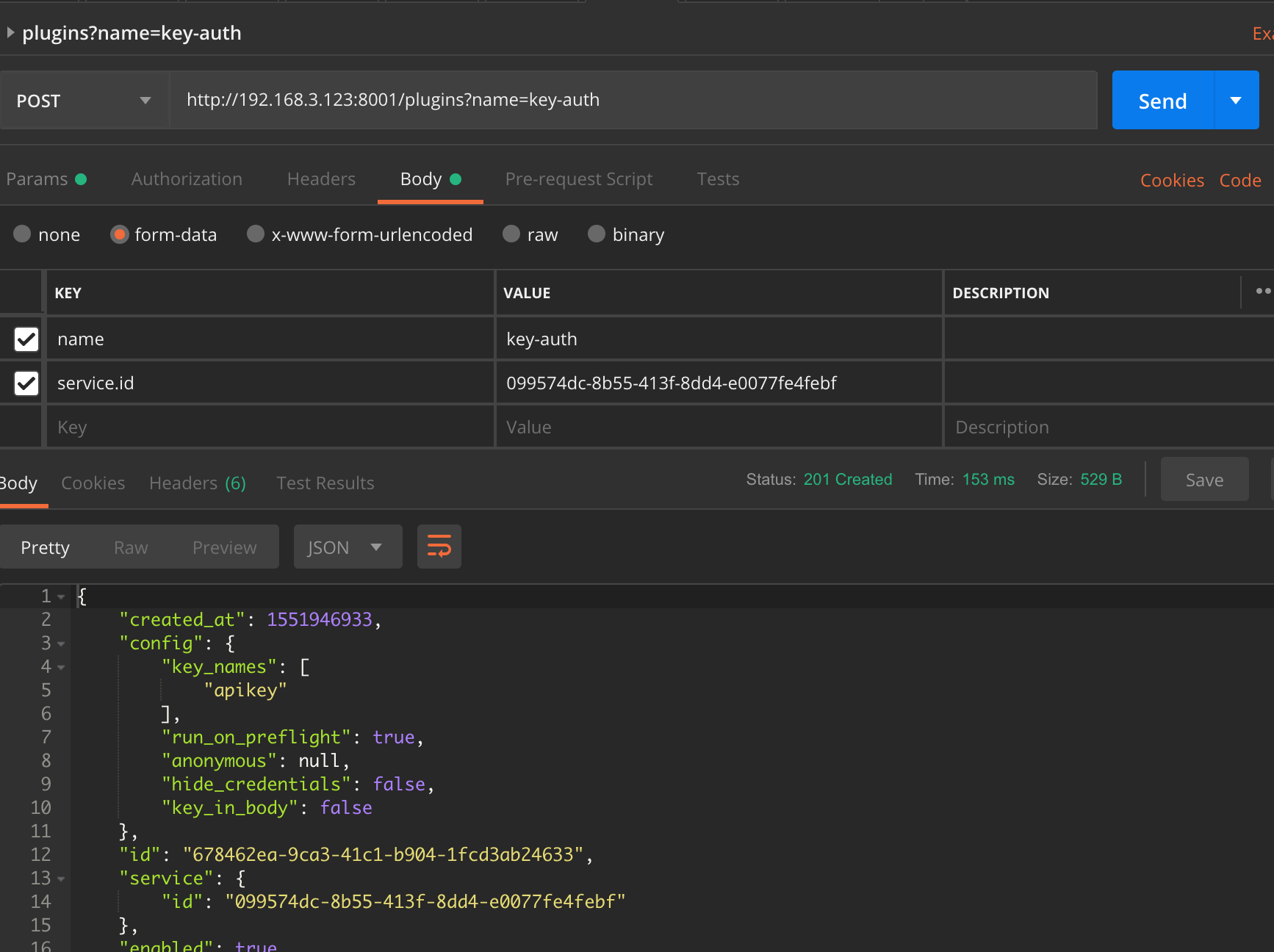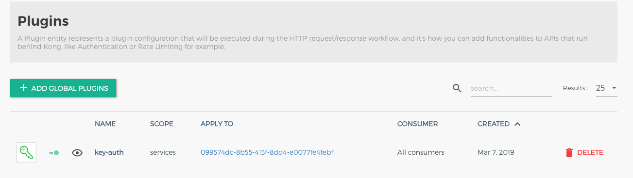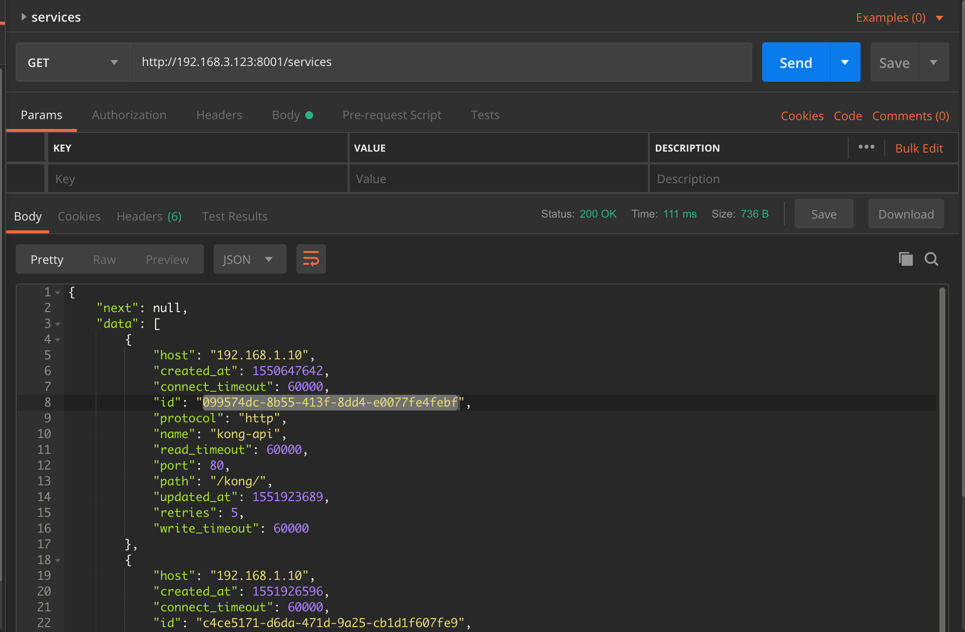 通过上述UI配置的插件的生效范围都是全局生效的,当然一般我们一个网关可能代理了N个service的入口,如果插件的生效范围只是全局基本上就限制了使用范围,当然kong的设计者考虑的比较周到,是否全局都可,但是此时的konga并没有支持部分生效的UI配置,所以我们只能通过使用官方管理API的方式来创建只对于莫个service生效的插件,首先我们需要获取service的ID,通过kong的API文档