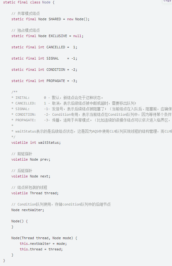 每种类型的结点都有一些状态,其中独占结点使用其中的CANCELLED(1)、SIGNAL(-1)、CONDITION(-2),共享结点使用其中的CANCELLED(1)、SIGNAL(-1)、PROPAGATE(-3)。