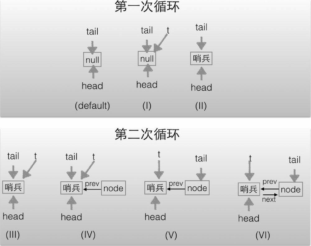 到现在为止只插入了一个哨兵节点,还需要插入node节点,所以在第二次循环后执行到代码(1),这时候队列状态如图中(III)所示;然后执行代码(3)设置node的前驱节点为尾部节点,这时候队列状态如图中(IV)所示;