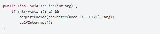 该方法以独占方式获取资源,如果获取到资源,线程继续往下执行,否则进入等待队列,直到获取到资源为止,且整个过程忽略中断的影响。该方法是独占模式下线程获取共享资源的顶层入口。