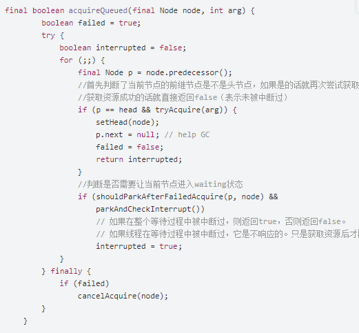 acquireQueued这个关键方法。首先要注意的是这个方法中哪个无条件的for循环,这个for循环说明acquireQueued方法一直在自旋尝试获取资源。进入for循环后,首先判断了当前节点的前继节点是不是头节点,如果是的话就再次尝试获取资源,获取资源成功的话就直接返回false(表示未被中断过)假如还是没有获取资源成功,判断是否需要让当前节点进入