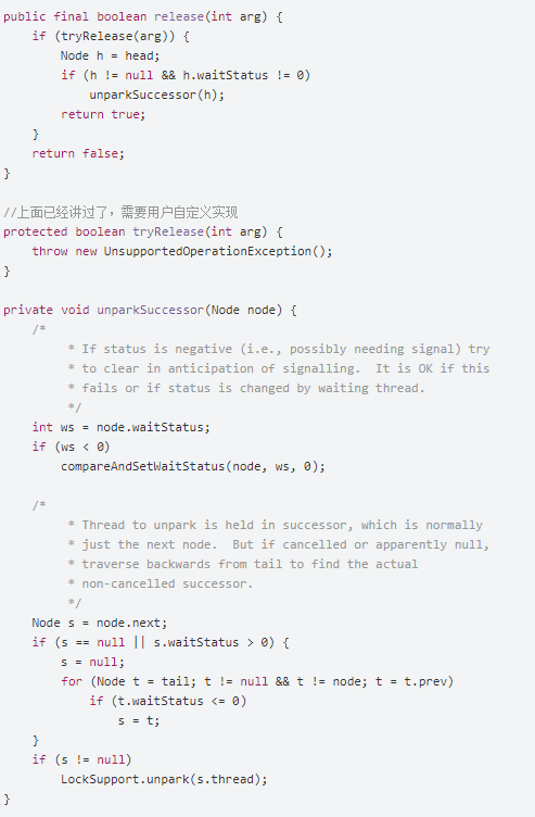 总之,release()是独占模式下线程释放共享资源的顶层入口。它会释放指定量的资源,如果彻底释放了(即state=0),它会唤醒等待队列里的其他线程来获取资源。(需要注意的是队列中被唤醒的线程不一定能立马获取资源,因为资源在释放后可能立马被其他线程(不是在队列中等待的线程)抢掉了)