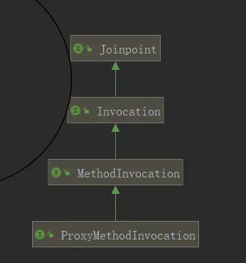 如上所示,MethodInvocation 的实现类 ReflectiveMethodInvocation 获取到传入的参数之后,执行 proceed 方法,获取到前置通知拦截器逻辑,然后通过反射进行调用。关于 ReflectiveMethodInvocation 类,又继承自 JoinPoint 接口,所以我们看一下这些定义之间的继承关系: