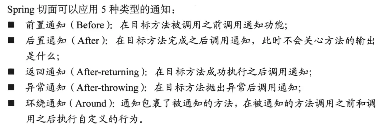 - 运行期:切面在应用运行的某个时刻被织入。一般情况下,在织入切面时,AOP 容器会为目标对象动态地创建一个代理对象。Spring AOP 就是以这种方式织入切面的。