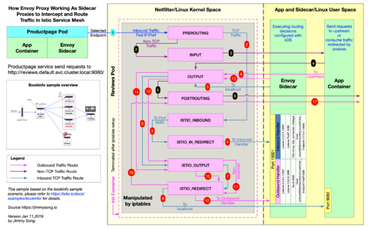下图是具体 iptables 与 Sidecar 之间互作用原理,来源: