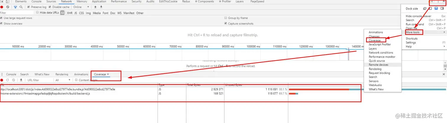 这里先提一下,浏览器的Coverage,能够检测页面上运行中用到了哪些css和js。什么是Audits