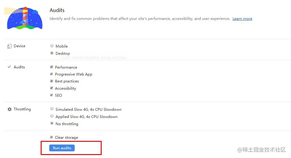 Audits是站点的审计员,页面的大管家。他在5个大的方面对网站进行检测: Performance(性能),Accessiblity(可访问性),Best Practices(最佳实践),SEO(搜索引擎优化),Progressive Web App(渐进式网页应用)。