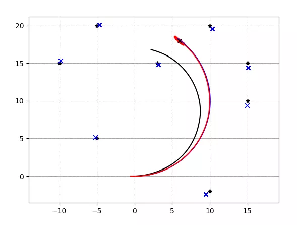红线为目标路线,绿叉为纯追迹控制的目标点,蓝线为跟踪路线。