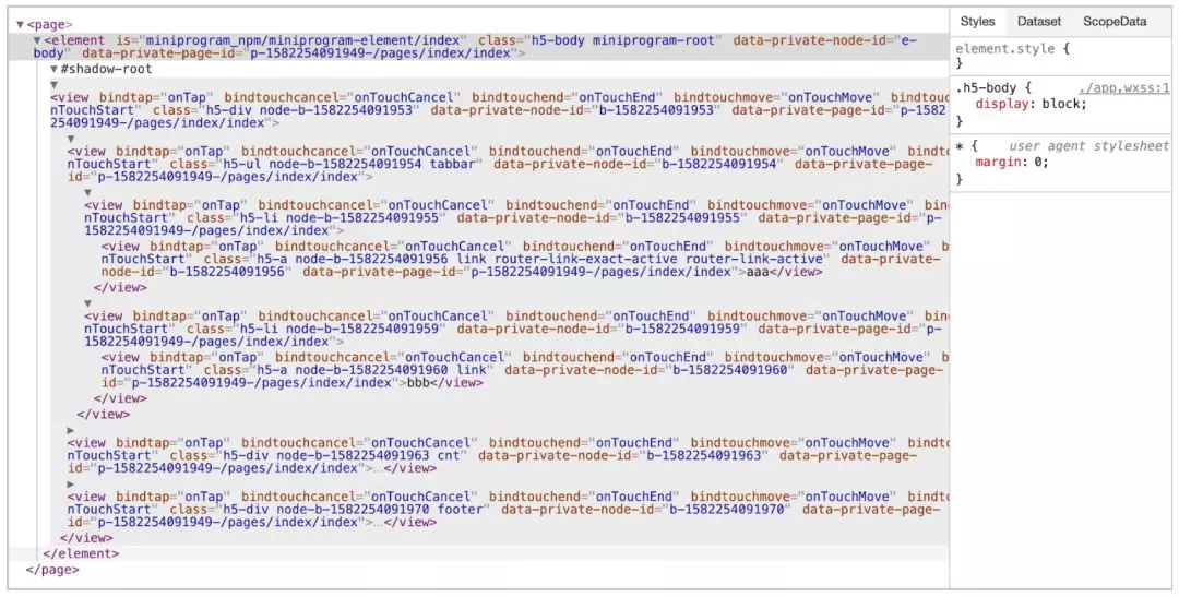 这个问题有点大。前面的问题,可以通过改代码或新项目通过技术选型避开。但是在开发的过程中,没有调试工具,这是个灾难。目前唯一能用的只有 wxml 节点树页面。但是这个的问题也很大。绝大部分的元素都渲染成了 view,并且每个节点都差不多。例如下图,这一堆东西,看到就头疼。