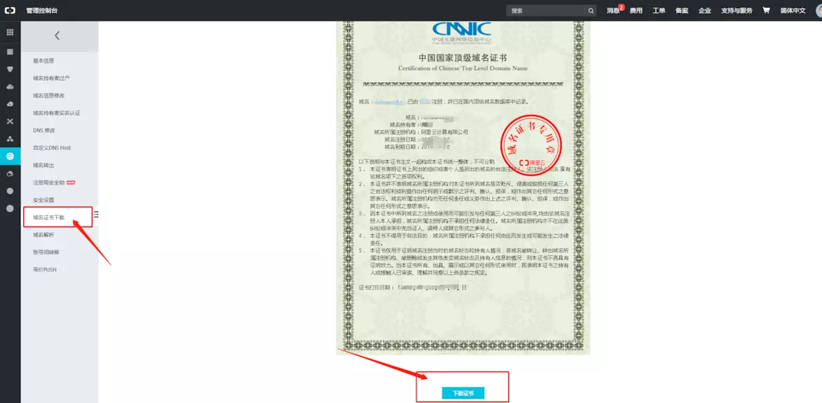 在域名列表中选择要备案的域名点击管理,进入域名管理界面,点击左侧域名证书下载菜单进行下载即可。
