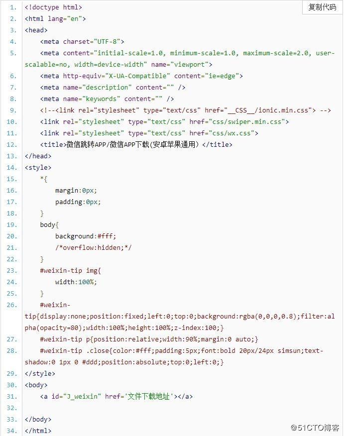 这种方式最大的好处就是无论你的链接是否已经被拦截都可以正常从微信内跳出浏览器访问。这样一来用户就无需再复制链接手动前往浏览器下载app或访问网页了。是不是觉得特别赞,觉得好就分享给更多的朋友知道吧。直接上代码: