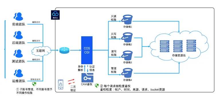 这里以COS的数据访问权限控制为例:为公司中的不同团队授予子账户,通过访问方式、账户权限隔离来分级控制不同账户的资源操作范围。高危操作(如删除数据)权限可剖离出来,仅允许控制台操作,同时通过MFA校验来进行二次认证。