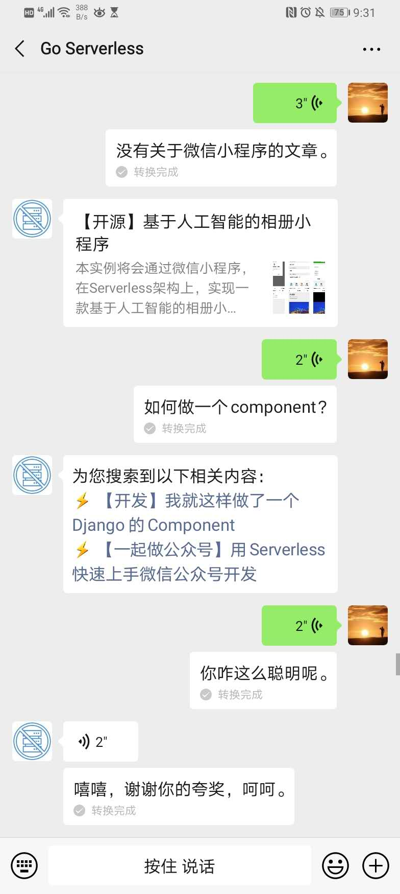 首先假设一个场景:用户关注这个公众号之后,他给公众号发送文本消息,我们首先进行图文检索,如果没找到合适的结果,我们就默认进入“聊天功能”;如果用户发送了语音,我们同样先进行图文检索,如果没有找得到相似图文,则通过语音进入“聊天功能”,这样看来是不是整个功能变得非常有趣?