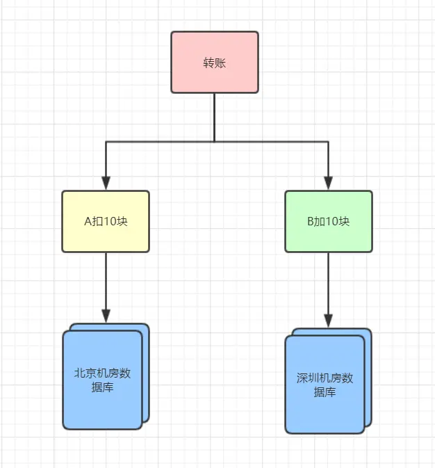 比如A转10块给B,A的账户数据是在北京机房,B的账户数据是在深圳机房。流程如下: