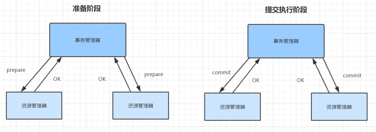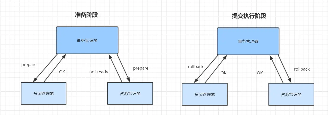 准备阶段,事务管理器向每个资源管理器发送准备消息,如果资源管理器的本地事务操作执行成功,则返回成功,如果执行失败,则返回失败。