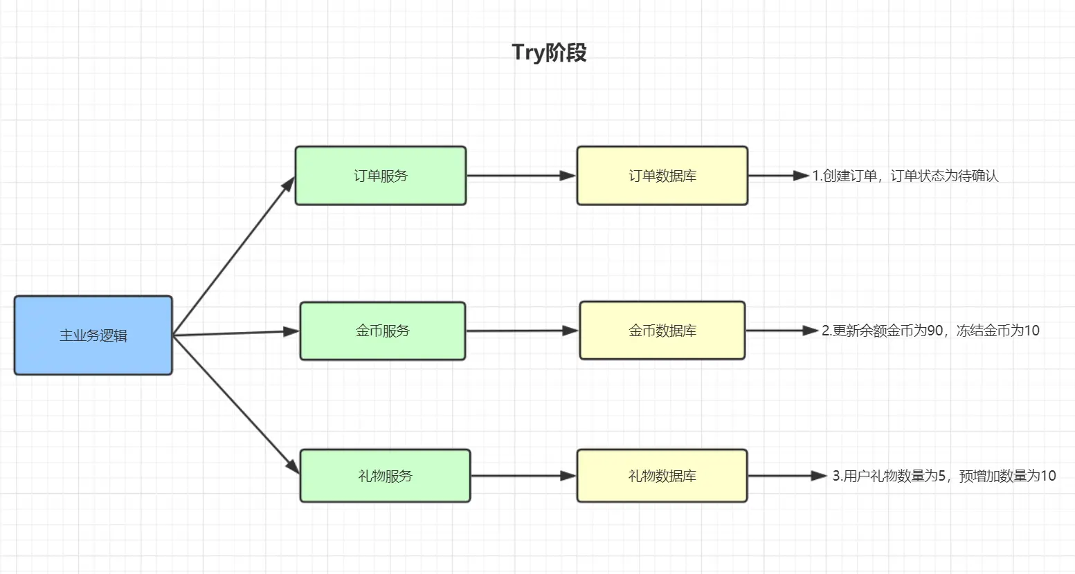 try阶段: 尝试去执行,完成所有业务的一致性检查,预留必须的业务资源。