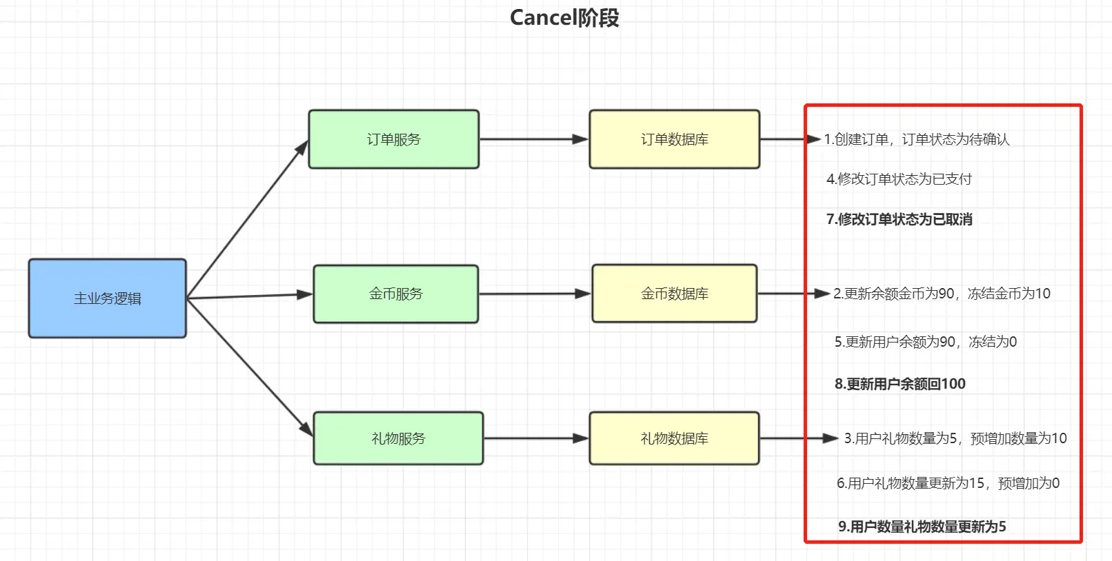 Cancel 阶段:若业务执行失败,则进入该阶段,它会释放try阶段占用的所有业务资源,并回滚Confirm阶段执行的所有操作。
