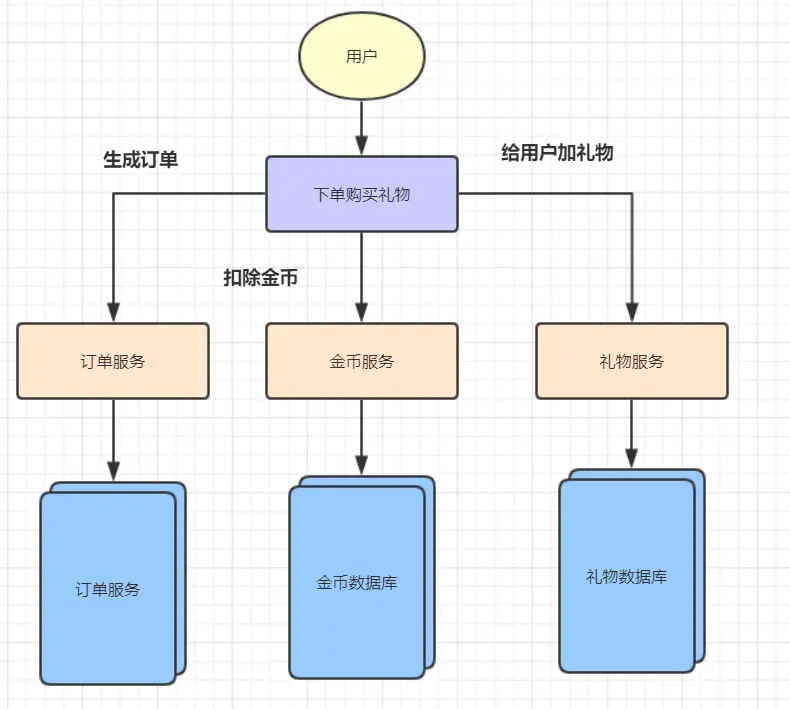 随着互联网的快速发展,轻盈且功能划分明确的微服务,登上了历史舞台。比如,一个用户下订单,购买直播礼物的服务,被拆分成三个service,分别是金币服务(coinService),下订单服务(orderService)、礼物服务(giftService)。这些服务都部署在不同的机器上(节点),对应的数据库(金币数据库、订单数据库、礼物数据库)也在不同节点上。