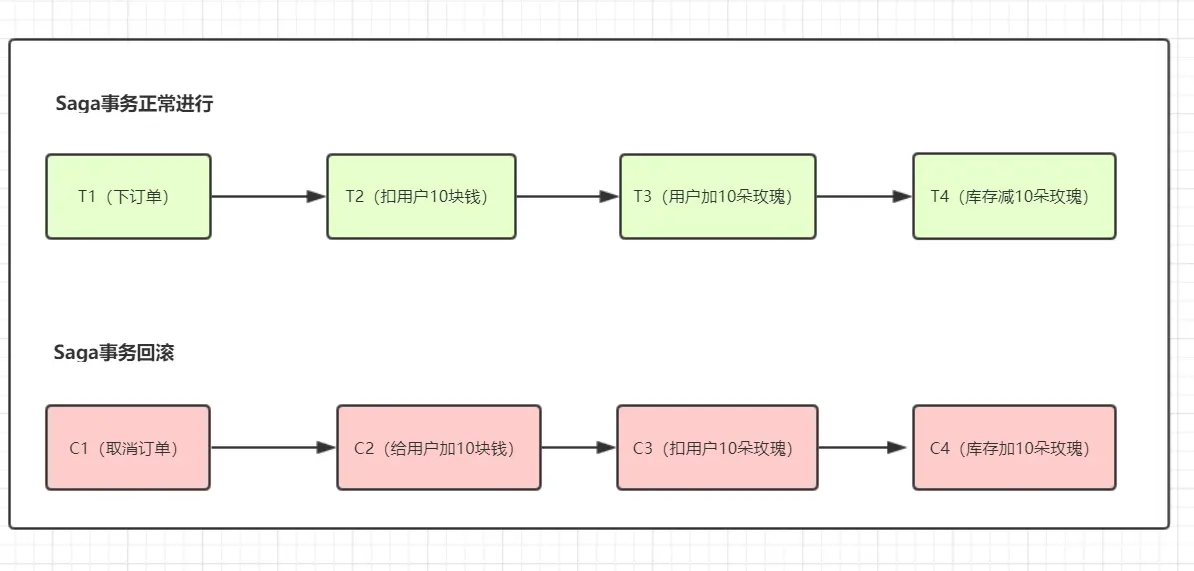 C1=取消订单 ,C2= 给用户加10块钱,C3 =用户减10朵玫瑰, C4=库存加10朵玫瑰