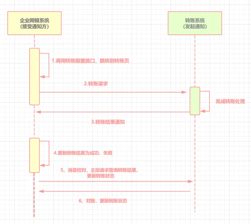 - 企业网银系统未接收到通知,会主动调用转账系统的接口查询转账结果。