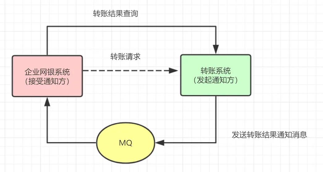 - 3、企业网银系统监听MQ,接收转账结果通知,如果接收不到消息,MQ会重复发送通知。接收到转账结果,更新转账状态。