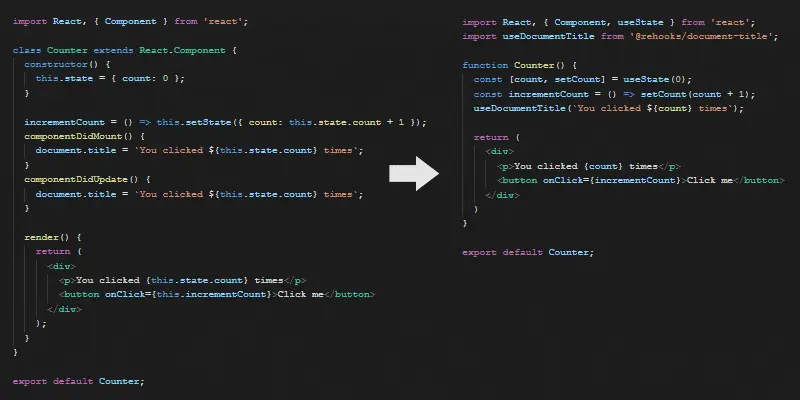 Hooks对于开发者又很对优点,它改变了我们书写组件的方式。可以帮助我们写出更清晰、更简洁的代码——就像我们进行了代码节食,我们减轻了很多体重,看起来更好,感觉更好。它使我们的下颌线突出,使我们的脚趾感到更轻。就像下面这样。