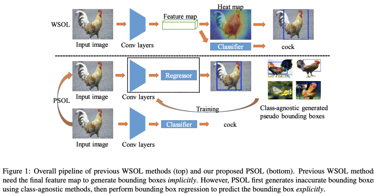 受selective search和Faster-RCNN的类不可知过程的启发,将WSOL分成两个子任务,类不可知的目标定位任务和目标分类任务,提出PSOL,直接通过伪GT bbox进行模型更新,不需要直接生成bbox,能够显著解决前面提到的问题