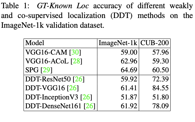- Datasets,使用ImageNet-1k和CUB-200,测试数据的bbox是准确标注的,而训练集上的bbox则通过前面提到的方法进行生成