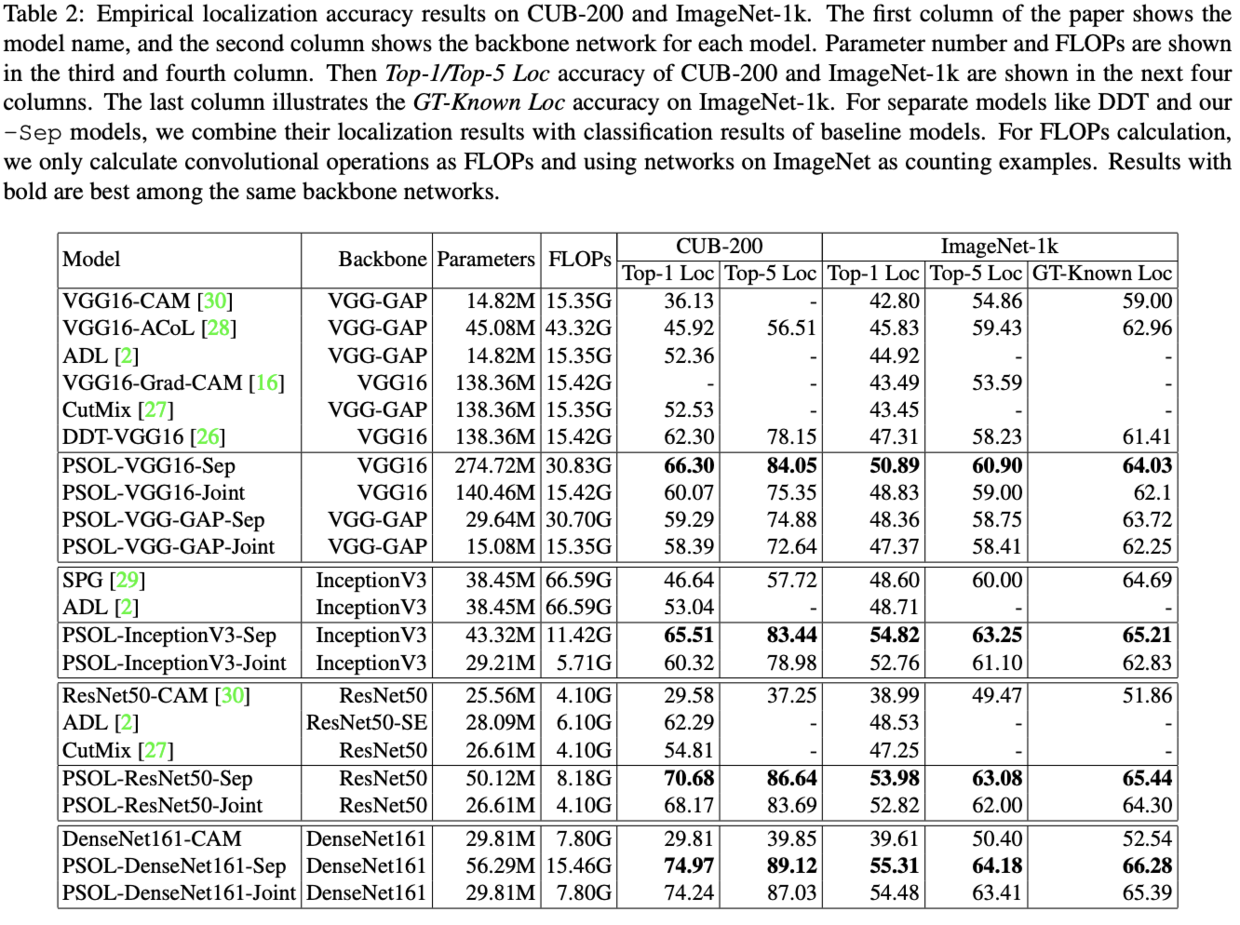 - Base Models,有VGG16/Inception V3/ResNet50/DenseNet161,没有增大图片输入,一些WSOL方法要用到类别信息的权重(单层全连接)来生成heatmap,而PSOL不用。为了公平起见,增加VGG-GAP,将所有全连接层换成单层全连接,而对于回归模型,仍然使用双层全连接层加对应的ReLU