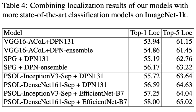 将分类部分的网络改为SOTA分类网络结合进行实验,PSOL性能依然比WSOL要好