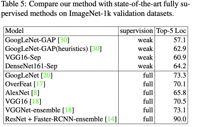 对比监督方法,这里论文的描述不是很清楚,表中有监督的分类网络应该都是使用WSOL方法+定位LOSS。从结果来看,从ILSVRC直接迁移过来的Faster-RCNN-ensemble精度最高,region proposal网络不需要fine-tuning就具有更好的处理不同类别的通用能力,说明定位与分类是分开的