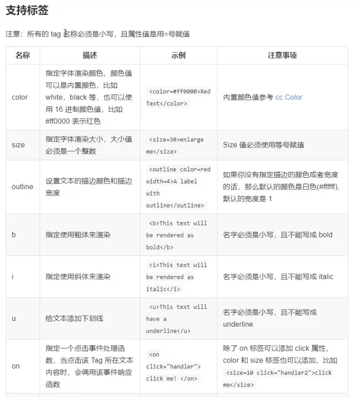 目前支持的标签类型有:size,color, b, i, u, img 和 on,分别用来定制字体大小,字体颜色, 加粗,斜体,下划线,图片和点击事件。 每一个标签都有一个起始标签和一个结束标签,起始标签的名字和属性格式必要符合要求,且全部为小写。 结束标签的名字不做任何检查,只需要满足结束标签的定义即可。