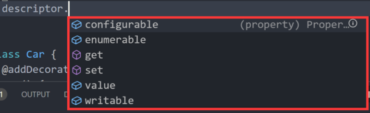 那 descriptor 是一个 PropertyDescriptor 的内置类型,那其实 PropertyDescriptor 对应着 JavaScript 的 Object.defineProperty() 的第三个参数 descrideptor,通过 IDE 的功能可以发现它有以下属性,完全对应上,descrideptor 就是控制函数的属性