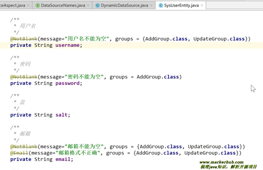 通过上面的实体类代码,我们来理解 Hibernate Validator 校验框架的使用。其中,username 属性,表示保存或修改用户时,都会效验 username 属性;而 password 属 性,表示只有保存用户时,才会效验 password 属性,也就是说,修改用户时,password 可以 不填写,允许为空。