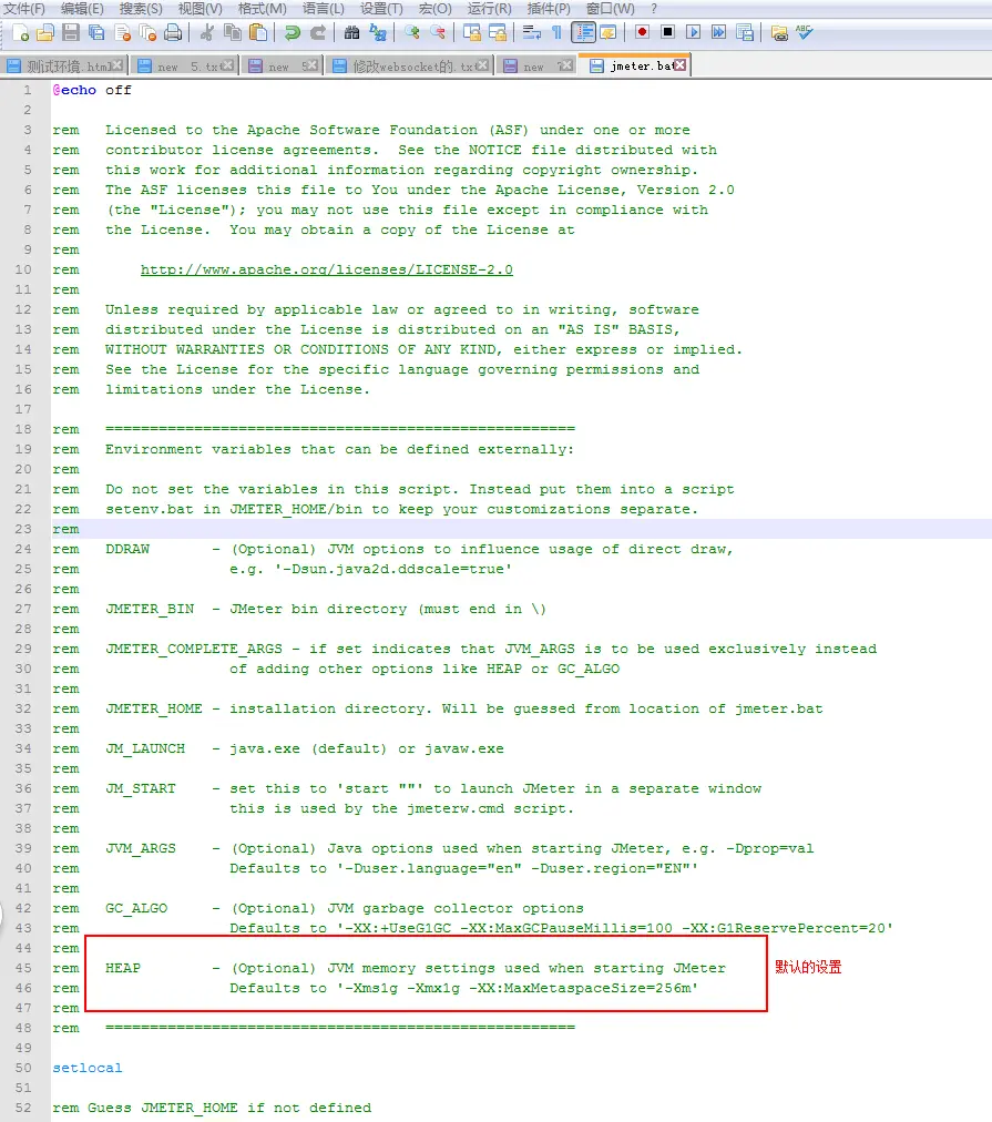 打开jmeter.bat,(win版本),看到heap的默认设置