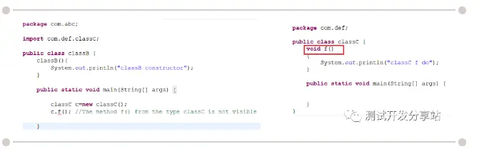 public修饰的成员对每个人都是可用的。 将"一、default"的例子中classC的f()访问修饰符改为public,则在包外的classB中访问则能编译通过。