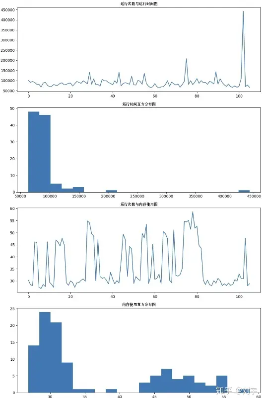 如果上一个函数,是一个非常平稳和光滑的函数,很容易预估资源使用率,那么这个函数则可以很明显看出波动,运行时间层面,可以看到绝大部分在150S以下,部分不到200S,最高峰值近450S,所以这个时候,我们就可以根据我们的业务需求来判定,这个突然之间增加到450S的请求,是否可以被中止,此时,我推荐将这个函数的超时时间设置为200S,至于内存部分,可以看到绝大部分都是40MB以内,部分出现在45-55MB,最高未超过60MB,所以此时可以推荐这个函数设置为64MB。