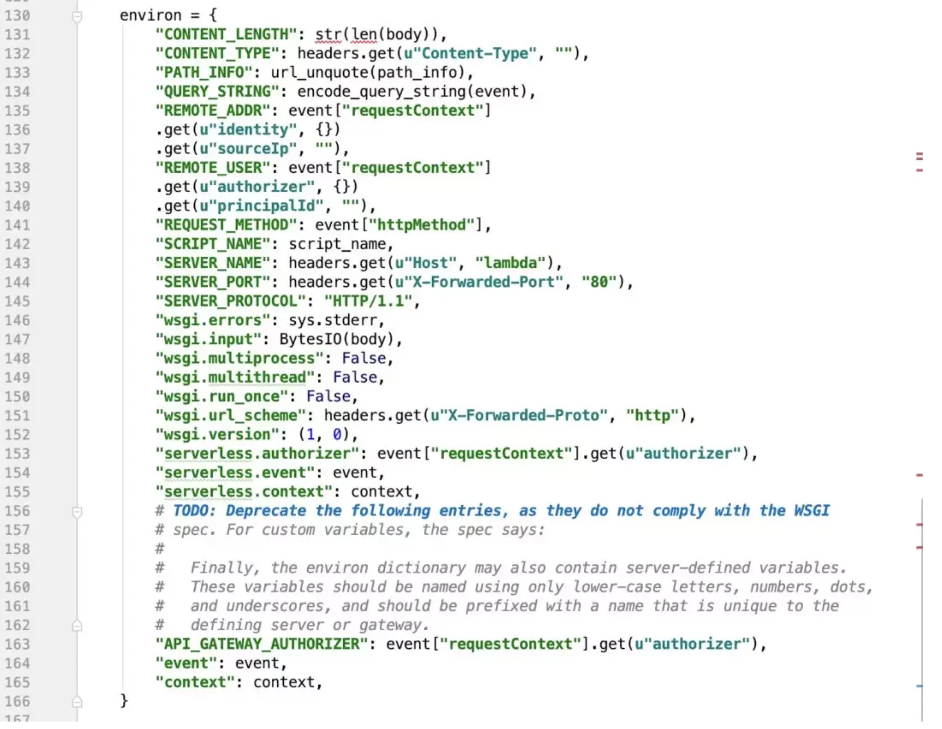 environ['REQUEST_METHOD'] = event['httpMethod']