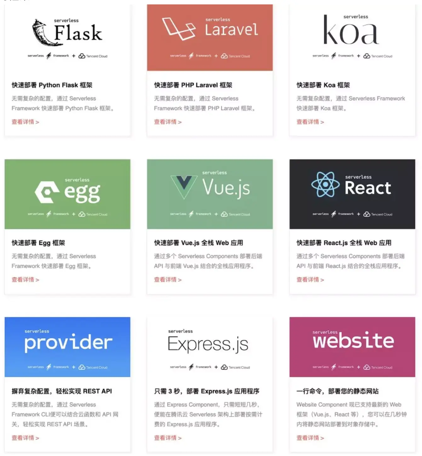 之前有过朋友问我Flask、Express这些框架是如何在函数中运行,他是怎么样的一个机制?还有人问我如何做一个Component?看了一下腾讯云Serverless架构现在支持的框架: