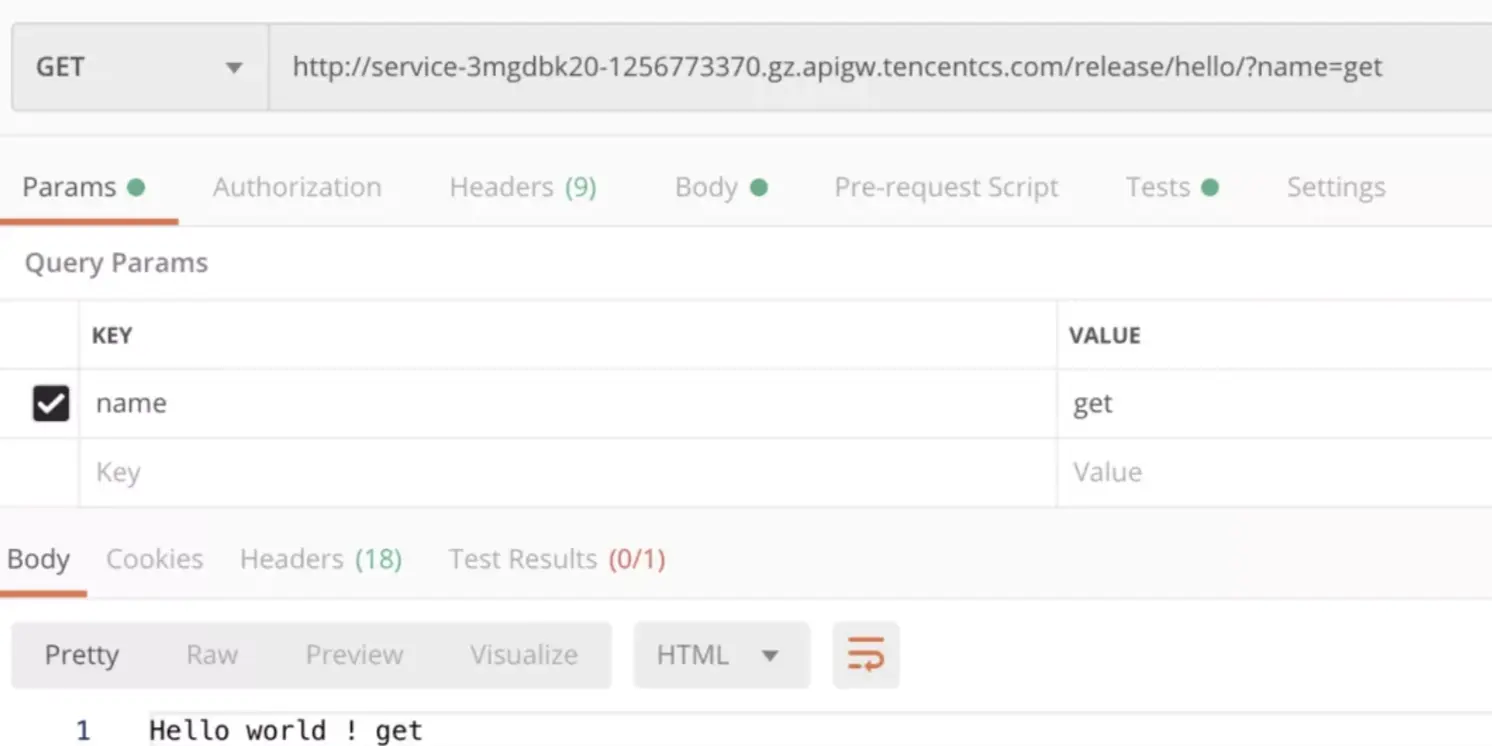 通过部署完成,并绑定apigw触发器,然后在postman中进行测试: get:
