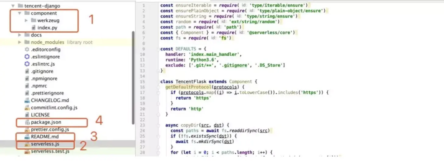 第一部分,是我们可能会依赖的一个依赖包,以及我们刚才放入的index.py文件。在用户调用这个Component的时候,我们会把这两个文件,放入用户的代码中,一并上传。 第二部分是Serverless.js部分,这里的一个基本格式: