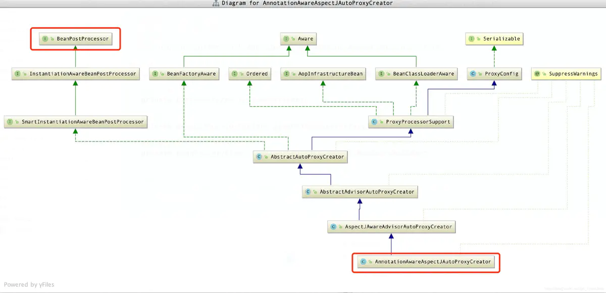 上一节分析了aspectj-autoproxy标签的解析过程,并注册了AnnotationAwareAspectJAutoProxyCreator。但是该类的作用是什么呢,看起来茫然无措,这时不妨查看一下类的继承关系结构。