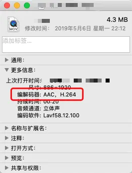 下面我们来看一下一个.mov格式的视频文件,编解码器这一项有AAC和H264,这两个就是视频的音频编码和视频编码,.mov就是视频的封装格式