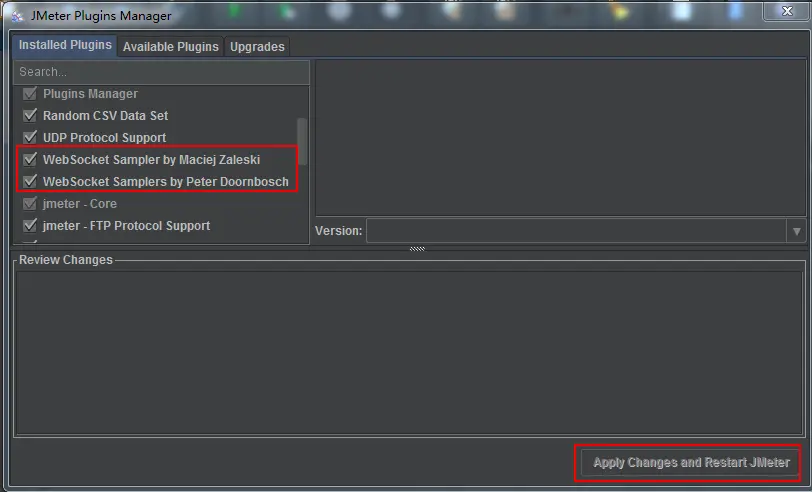 4,安装插件,勾选上websocket相关的,应用并重启jmeter