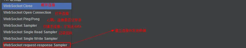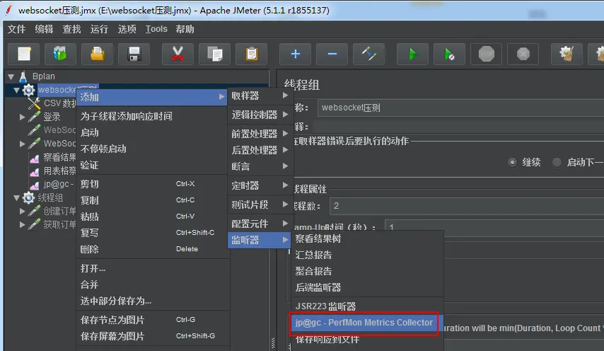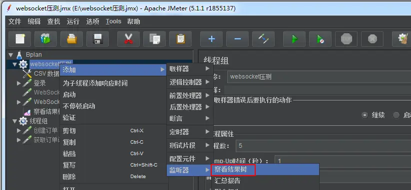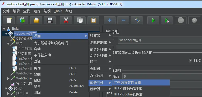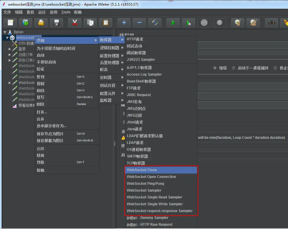 5,新建测试计划,建立线程组,右键线程组>添加>取样器,就可以看到WebSocket相关的sampler了