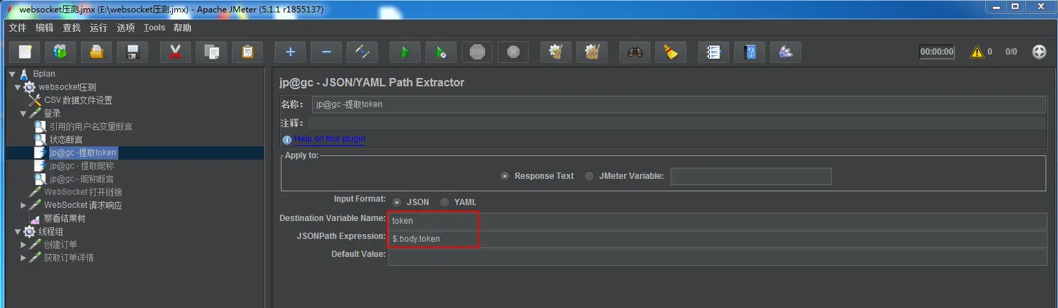 在登录请求后添加后置处理器jp@gc-JSON/YAML Path Extractor,设置token这个变量,把响应报文中的token提取出来并赋值给token变量